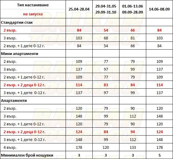 За места в хотела и калкулация на цена ни трябват точни дати от/до, брой нощувки, колко възрастни и деца в стая, навършени години на децата. Ползвайте бутона - Резервирай за да видите всички цени Или се обадете на 02 / 950 22 05, 02 / 980 1004, 0885 596 067