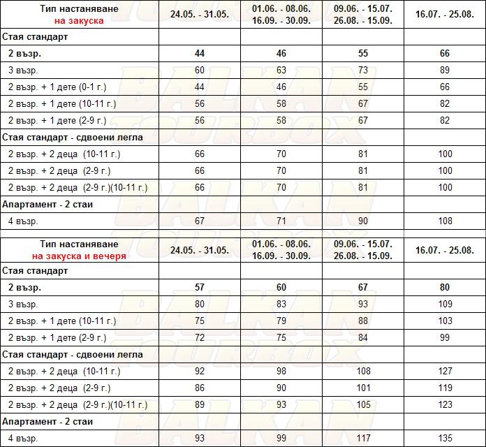 За места в хотела и калкулация на цена ни трябват точни дати от/до, брой нощувки, колко възрастни и деца в стая, навършени години на децата. Ползвайте бутона - Резервирай за да видите всички цени Или се обадете на 02 / 950 22 05, 02 / 980 1004, 0885 596 067