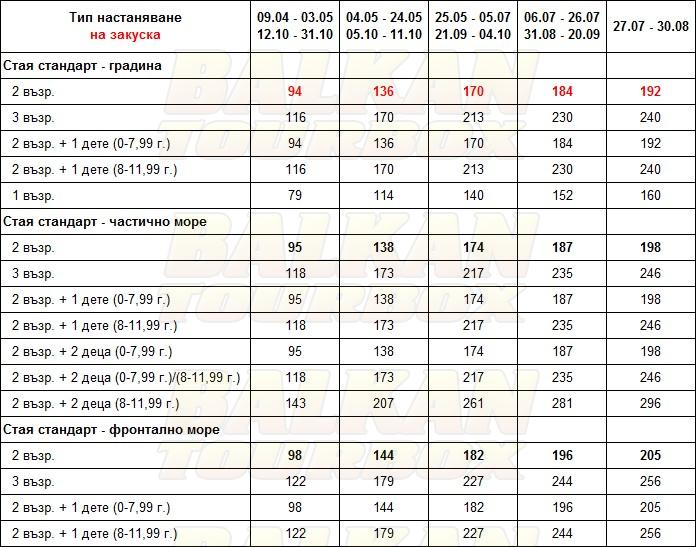 За места в хотела и калкулация на цена ни трябват точни дати от/до, брой нощувки, колко възрастни и деца в стая, навършени години на децата. Ползвайте бутона - Резервирай за да видите всички цени Или се обадете на 02 / 950 22 05, 02 / 980 1004, 0885 596 067