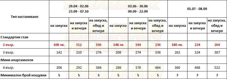 За места в хотела и калкулация на цена ни трябват точни дати от/до, брой нощувки, колко възрастни и деца в стая, навършени години на децата. Ползвайте бутона - Резервирай за да видите всички цени Или се обадете на 02 / 950 22 05, 02 / 980 1004, 0885 596 067