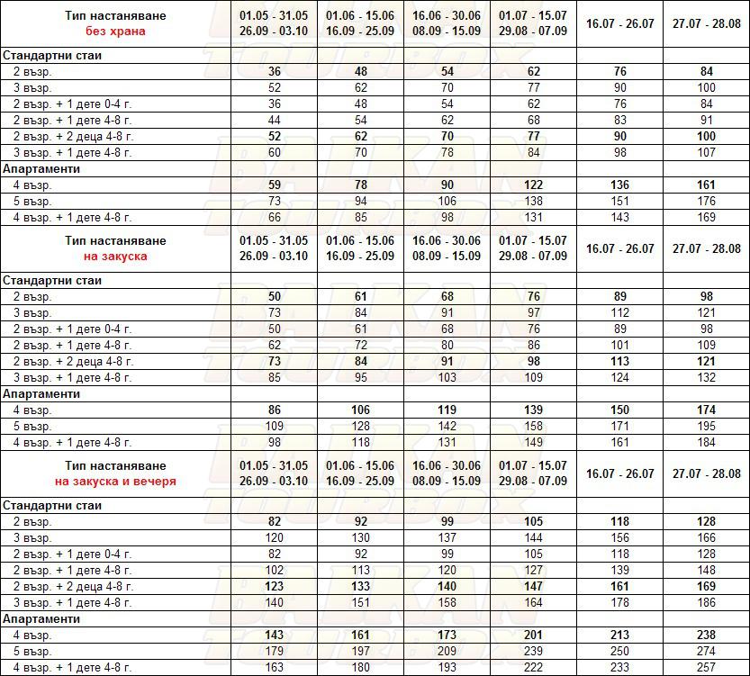 За места в хотела и калкулация на цена ни трябват точни дати от/до, брой нощувки, колко възрастни и деца в стая, навършени години на децата. Ползвайте бутона - Резервирай за да видите всички цени Или се обадете на 02 / 950 22 05, 02 / 980 1004, 0885 596 067