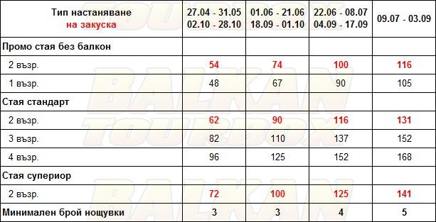 За места в хотела и калкулация на цена ни трябват точни дати от/до, брой нощувки, колко възрастни и деца в стая, навършени години на децата. Ползвайте бутона - Резервирай за да видите всички цени Или се обадете на 02 / 950 22 05, 02 / 980 1004, 0885 596 067
