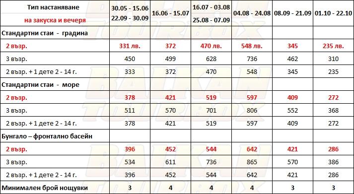 За места в хотела и калкулация на цена ни трябват точни дати от/до, брой нощувки, колко възрастни и деца в стая, навършени години на децата. Ползвайте бутона - Резервирай за да видите всички цени Или се обадете на 02 / 950 22 05, 02 / 980 1004, 0885 596 067