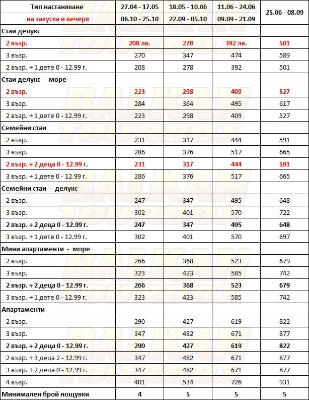 За места в хотела и калкулация на цена ни трябват точни дати от/до, брой нощувки, колко възрастни и деца в стая, навършени години на децата. Ползвайте бутона - Резервирай за да видите всички цени Или се обадете на 02 / 950 22 05, 02 / 980 1004, 0885 596 067