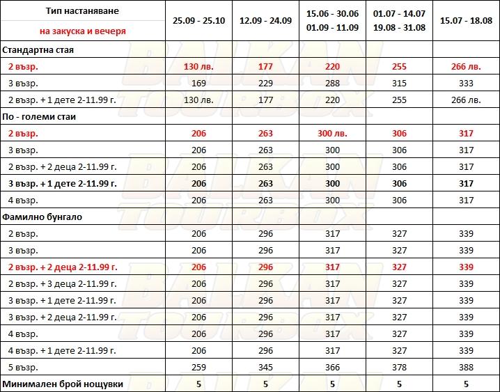 За места в хотела и калкулация на цена ни трябват точни дати от/до, брой нощувки, колко възрастни и деца в стая, навършени години на децата. Ползвайте бутона - Резервирай за да видите всички цени Или се обадете на 02 / 950 22 05, 02 / 980 1004, 0885 596 067