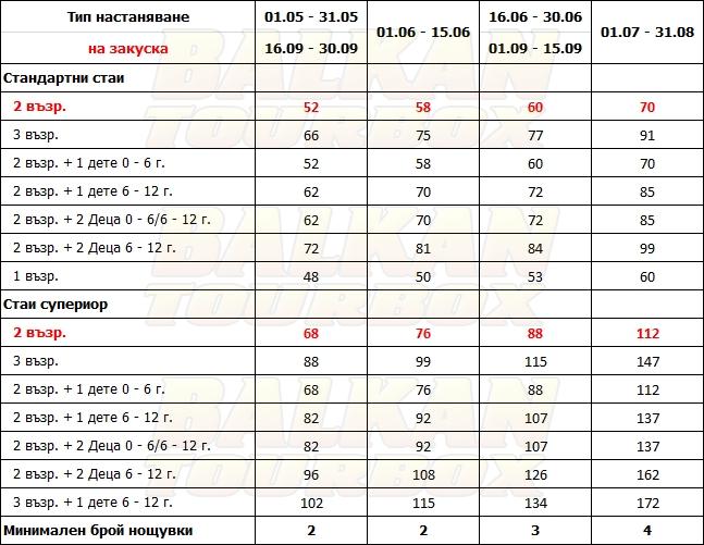 За места в хотела и калкулация на цена ни трябват точни дати от/до, брой нощувки, колко възрастни и деца в стая, навършени години на децата. Ползвайте бутона - Резервирай за да видите всички цени Или се обадете на 02 / 950 22 05, 02 / 980 1004, 0885 596 067