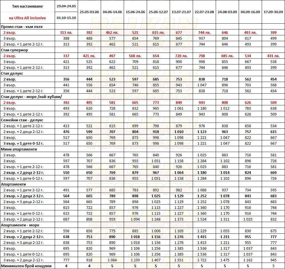 За места в хотела и калкулация на цена ни трябват точни дати от/до, брой нощувки, колко възрастни и деца в стая, навършени години на децата. Ползвайте бутона - Резервирай за да видите всички цени Или се обадете на 02 / 950 22 05, 02 / 980 1004, 0885 596 067