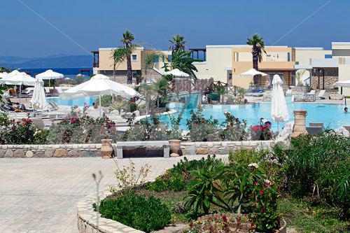 Hotel Natura Park Village is located on the beach in Psalidi in the northeast of the Kos Island, Greece. This 5-star spa hotel, built in 2009, offers 23 buildings and accommodation in 175 air-conditioned and soundproof guest rooms and suites with a safe deposit box, direct dial telephone, satellite TV, Internet access, minibar/ fridge, a balcony overlooking the Aegean Sea and a private bathrooms with a shower and hairdryer. The hotel Natura Park Village has is a lobby with a 24-hour reception, a currency exchange, hotel safe, bars and 3 restaurants. There is an indoor pool, an outdoor swimming pool and children's swimming area, spa with well equipped gym, a hot tub, a sauna, a steam room and massage, tennis courts, table tennis.The hotel offers all-inclusive packages.