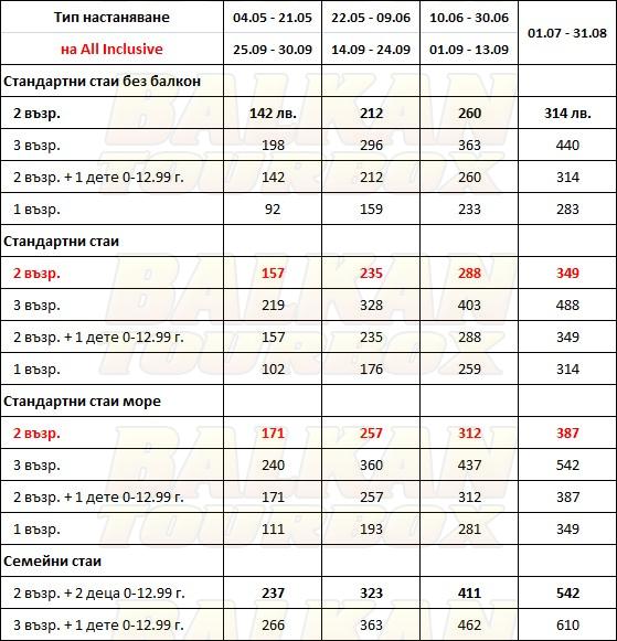 За места в хотела и калкулация на цена ни трябват точни дати от/до, брой нощувки, колко възрастни и деца в стая, навършени години на децата. Ползвайте бутона - Резервирай за да видите всички цени Или се обадете на 02 / 950 22 05, 02 / 980 1004, 0885 596 067