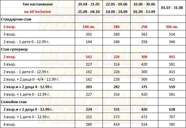 За места в хотела и калкулация на цена ни трябват точни дати от/до, брой нощувки, колко възрастни и деца в стая, навършени години на децата. Ползвайте бутона - Резервирай за да видите всички цени Или се обадете на 02 / 950 22 05, 02 / 980 1004, 0885 596 067