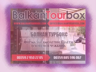 BALKAN TOURBOX Ltd. is a Tourist agency, offering its now numerous clients complete service, in the sphere of tourist and transportation services, as well as the sector’s accompanying insurance, legal, and consulting activities. You could easily reserve place reservations with us for airline tickets, rooms in over 160 thousand hotels the world over, vacation in Greece, vacation in Turkey, vacation in Bulgaria, vacation in Croatia, vacation in Montenegro, trips abroad, cruises, conference events.