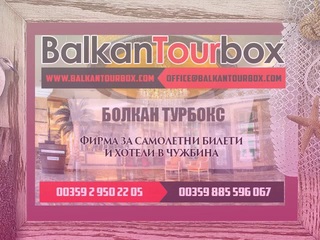 BALKAN TOURBOX Ltd. is a Tourist agency, offering its now numerous clients complete service, in the sphere of tourist and transportation services, as well as the sector’s accompanying insurance, legal, and consulting activities. You could easily reserve place reservations with us for airline tickets, rooms in over 160 thousand hotels the world over, vacation in Greece, vacation in Turkey, vacation in Bulgaria, vacation in Croatia, vacation in Montenegro, trips abroad, cruises, conference events.