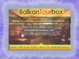 BALKAN TOURBOX Ltd. is a Tourist agency, offering its now numerous clients complete service, in the sphere of tourist and transportation services, as well as the sector’s accompanying insurance, legal, and consulting activities. You could easily reserve place reservations with us for airline tickets, rooms in over 160 thousand hotels the world over, vacation in Greece, vacation in Turkey, vacation in Bulgaria, vacation in Croatia, vacation in Montenegro, trips abroad, cruises, conference events.